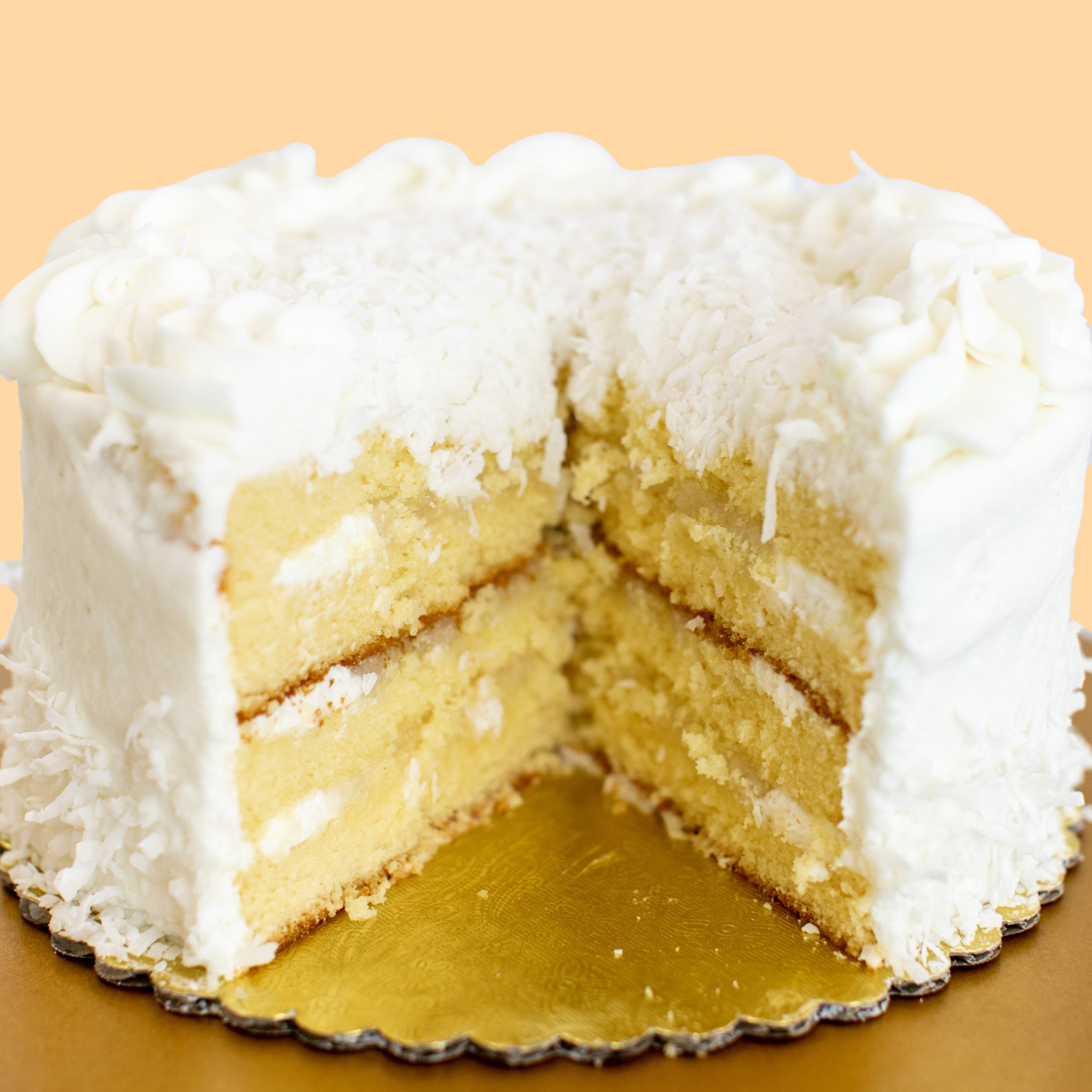 Our 8’’ coconut cream layer cake is made up of four layers of traditional butter cake, filled with our plantation coconut custard, iced in white buttercream, and topped with handfuls of shredded coconut. A simple but delicious treat, this cake is perfect for anyone who loves the classics!